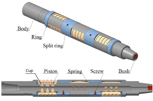 SG scraper consists of a body, blades, pistons, spring retainers, screws, split ring and bushing.