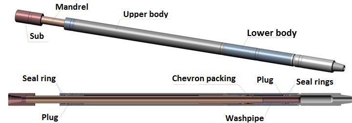 The jar intensifier consists of a body, a mandrel, a sub and a set of sealing elements. The mandrel is thread connected to the sub, having a box tool joint, on the upper end and washpipe on the lower end. Chevron packing is installed between mandrel shoulder and washpipe.The body consists of four parts that are thread interconnected. The mandrel has splined section engaged with matching splines in the upper part of the body. This allows torque to be transmitted through the tool. Lower part of the body ends with a pin thread.