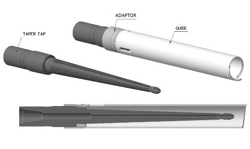 The taper tap is a steel tube section with carburized V-shaped wickers with ¾” TPF (1:16) and lengthwise flutes, which facilitate tapping and flash out the cuttings while engaging the fish, at the lower end and a box thread to connect to the fishing string at the upper end.