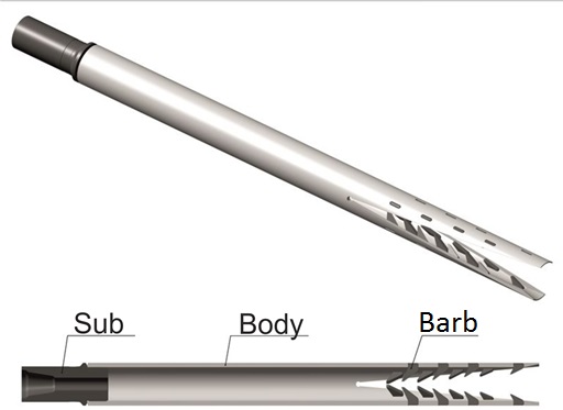 Rugged design of the wireline grab enables efficient cable retrieval. Located inside the heavy-duty prongs, barbs increase in size from bottom to top, thereby clutching even tight wire coils. Part of the wire gets packed inside the prongs. Increased number of barbs allows for retrieval of heavier loads. The top sub has an ample watercourse for circulation.