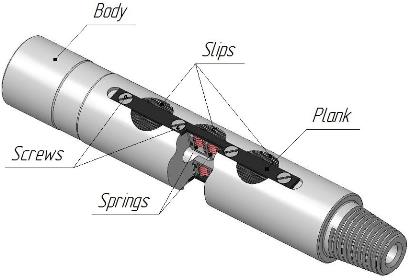 The Hydraulic Tubing Anchor consists of body, spring-fed slips (12 springs and 6 slips) retained by planks (2 pcs) secured with screws (9 pcs) and seals (6 pcs). The anchor is installed immediately after the mud motor. Increasing the flow at the surface generates a back pressure at the tool (chamber), which activates the slip mechanism and sets the slips against the tubing wall. With circulation decrease, the pressure drops and slips retracts away inside the tool body (in running position).